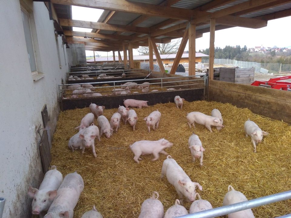 - In dem Aufzuchtstall haben die Ferkel viel Platz um sich zu bewegen, bekommen Stroh als Einstreu und Beschäftigungsmaterial und haben einen großen Auslauf. Auch hier haben alle Ferkel eine beheizte Ruhekiste. Nach ungefähr 6 Wochen werden die Ferkel dann an verschiedene Bioland-Mastbetriebe verkauft.